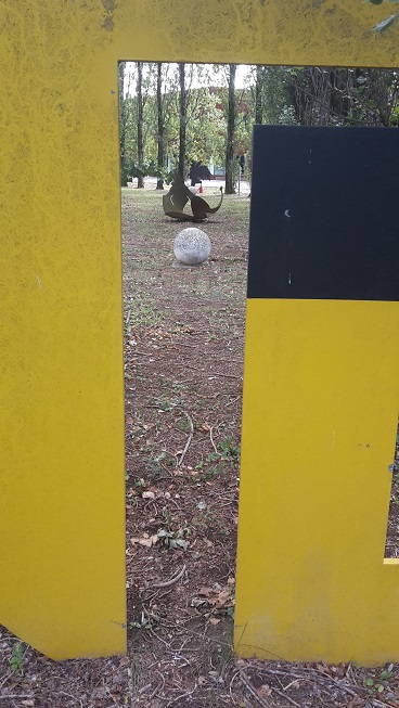 La scultura è un "aggeggio" (vedi a destra) per inquadrare i vari angoli del parco all'interno di un rettangolo